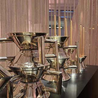 A seguire le opere degli artisti e designer racchiuse ciascuna in una nicchia ricavata dai già citati fini "tendaggi" che conferivano ad esse un senso di intima sacralità e di respiro nell'osservarle; "divisori" che, grazie alle loro trasparenze, riuscivano allo stesso tempo a far dialogare le opere l'una con l'altra in una scoperta di stili, tecniche e materiali differenti utilizzati da ogni autore con una maestria creativa e artigiana davvero notevoli. Come l'opera "Simposio" di Martinelli Venezia, fondato da Carolina Martinelli e Vittorio Venezia, preziosi oggetti in ottone presentati come testimoni della memoria per enfatizzare il rito del convivio, o l'opera di Agustina Bottoni "Grappolo", ampolle di vetro soffiato che richiamavano gli acini dell'uva accompagnate da una salda struttura in ottone massiccio posta a sostenerle come un raspo, con i quali ha rievocato l'oggetto del candelabro come simbolo di calore. Opere che avrei voluto descrivere e raccontare una per una e che invito i lettori a scoprire sul sito dell'Azienda: un incontro tra arti, discipline, tradizioni, realtà e personalità diverse che, come in una grande opera wagneriana, hanno trovato il loro punto di incontro e di massima espressione nella grande tavola allestita a fine mostra, un vero e proprio omaggio alla convivialità.